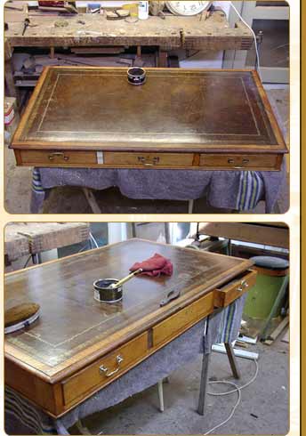 | WVelkommen til Desktopleather.com! På denne siden finner du alt du trenger å vite om skriveplater i skinn, stempler/mønsterdekorasjoner i bladgull og restaurering av antikke møbler. Velg form, skinnfarge og mønstertrykk i bladgull. Det er enkelt å få et ’skreddersydd’ pristilbud. Desktopleather.com’s spesialiteter: • Skrive-, skrivebords- og bordplater i skinn med overflatebehandling (kantmønster) i bladgull. • Restaurering/påføring av skriveplater i skinn. • Antikk restaurering. Nesten 20 års erfaring i antikk restaurering gjør Desktopleather.com til et unikt skinnvarer- og restaureringsatelier i Europa. |